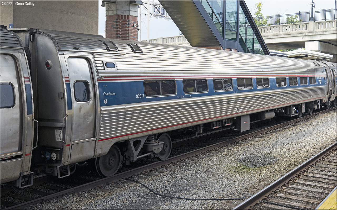 Built as a long-distance coach with 60 seats and 2 dressing rooms in October 1976 and numbered 21845.Trainline-equipped for push-pull operationan and refurbished for Metroliner service in July 1989 and renumbered 44945. Converted to a Capstone Business Class Coach with 62 seats in October 1999 and renumbered 81504. Converted to a Capstone car with 72 coach seats in October 2004 and renumbered 82517. Historical information about this car provided by www.amtrakbythenumbers.com. |