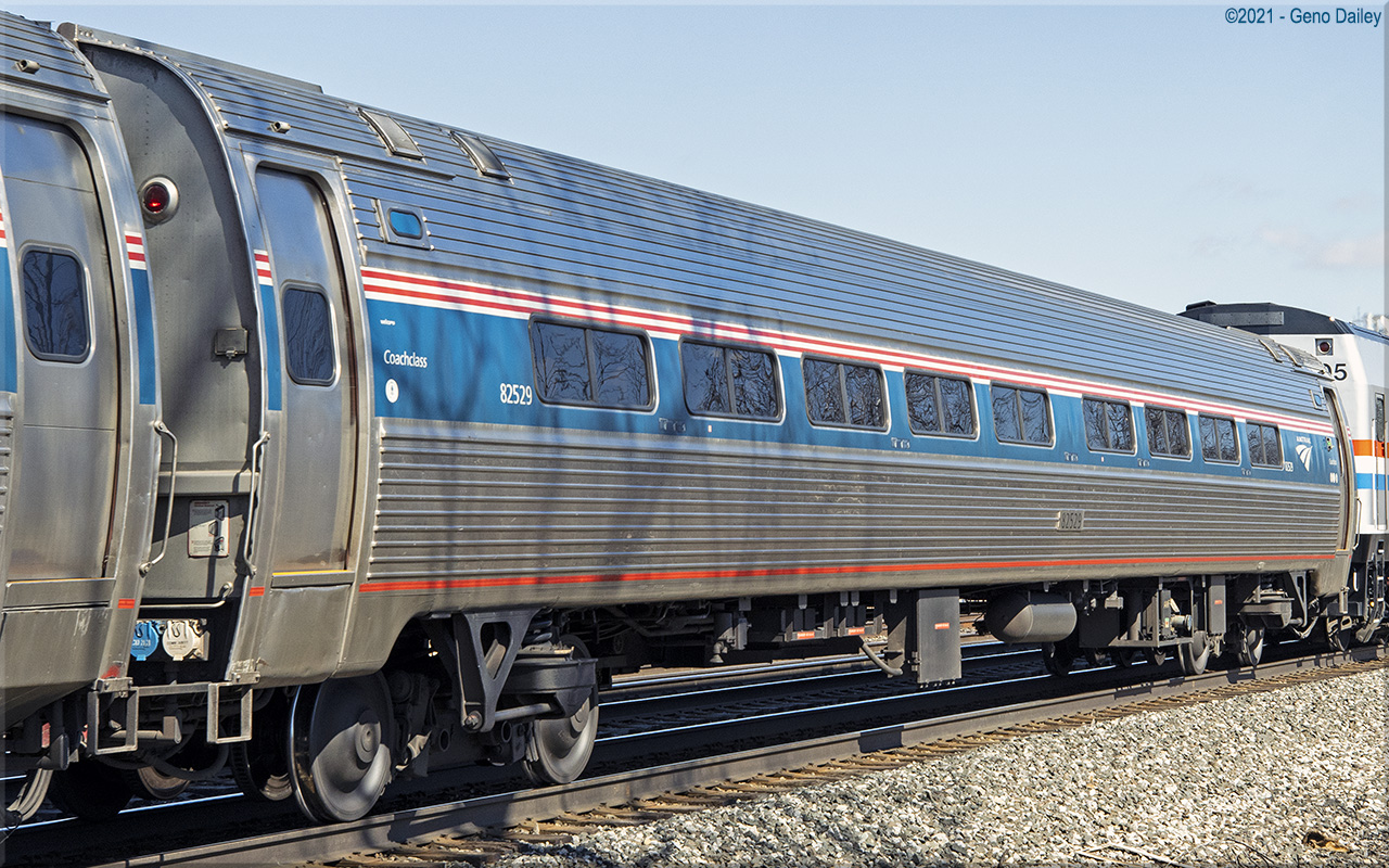 Built as a standard 84 seat coach in November 1976 and numbered 21207. Refurbished with ADA-compliant restrooms in January 1996 and renumbered 21624. Converted to a Capstone coach with 72 seats in March 2000 and renumbered 82047. Trainline-equipped for push-pull operation in April 2004 and renumbered 82529. Historical information about this car provided by www.amtrakbythenumbers.com. |