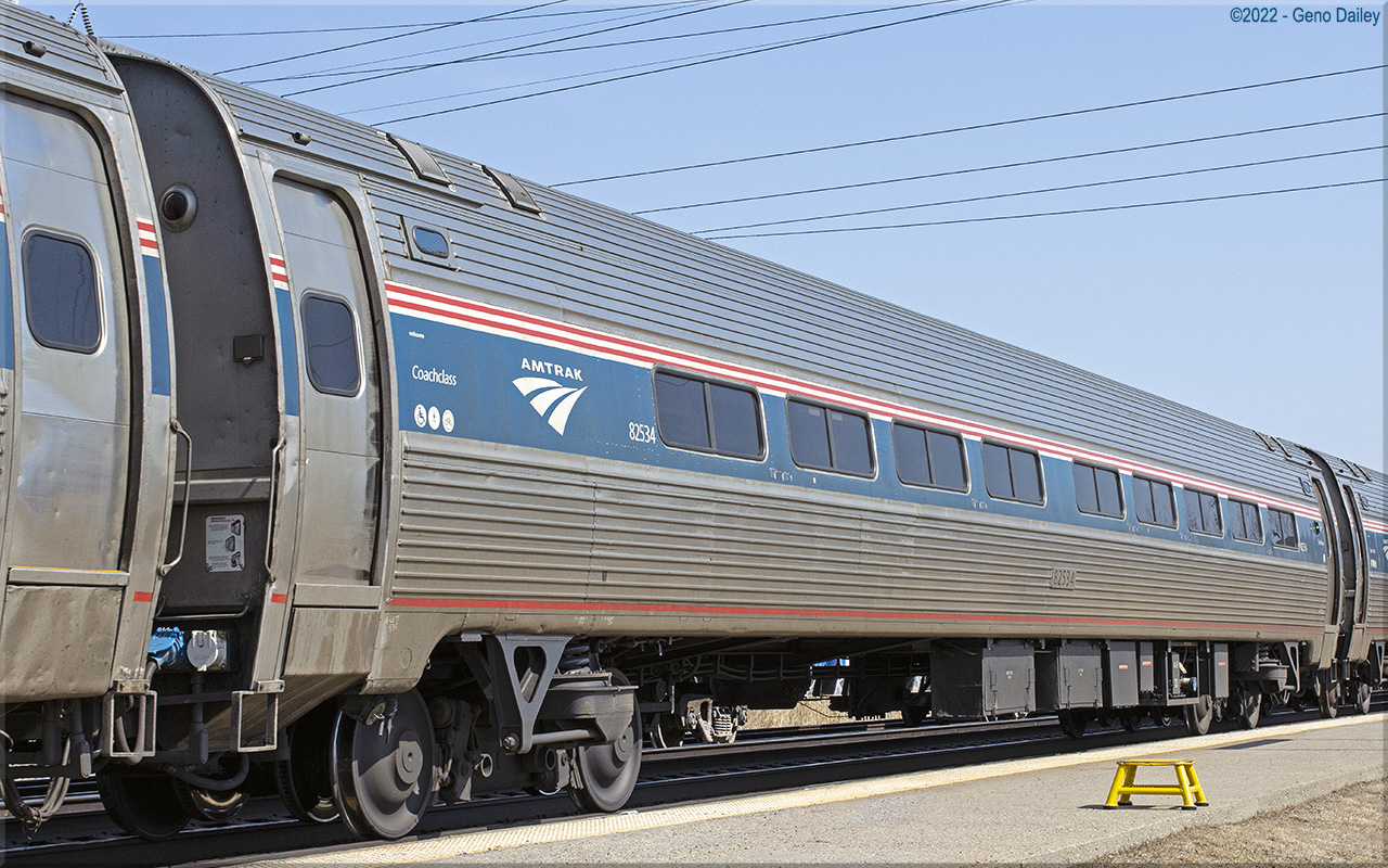 Built as a standard 84 seat coach in February 1976 and numbered 21115. Refurbished with ADA-compliant restrooms in January 1996 and renumbered 21628. Converted to a Capstone coach with 72 seats in April 2000 and renumbered 82051. Trainline-equipped for push-pull operation in August 2004 and renumbered 82534. Historical information about this car provided by www.amtrakbythenumbers.com. |