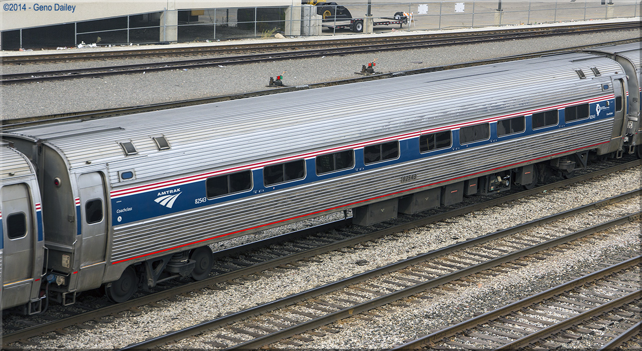 Built as a standard 84 seat coach in October 1975 and numbered 21041. Rebuilt with ADA-compliant restrooms in April 1996 and renumbered 21643. Converted to a Capstone coach with 72 seats in June 2000 and renumbered 82062. Trainline-equipped for push-pull operation in August 2004 and renumbered 82543. Historical information about this car provided by www.amtrakbythenumbers.com. |