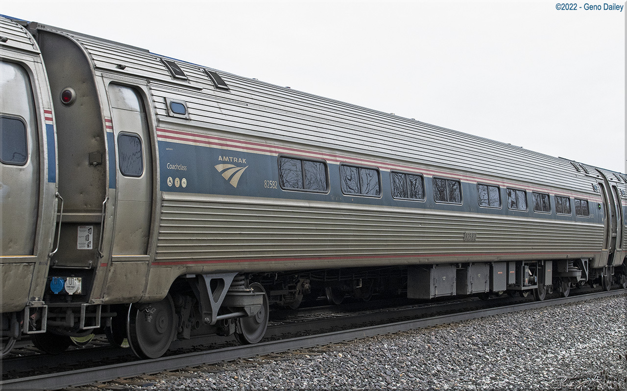 Built as a standard 84 seat coach in May 1976 and numbered 21172. Trainline-equipped for push-pull operation in August 1987 and renumbered 44172. Refurbished with ADA-compliant restrooms in June 1997 and renumbered 44602. Converted to a Capstone coach with 72 seats in September 2000 and renumbered 82582. Historical information about this car provided by www.amtrakbythenumbers.com. |