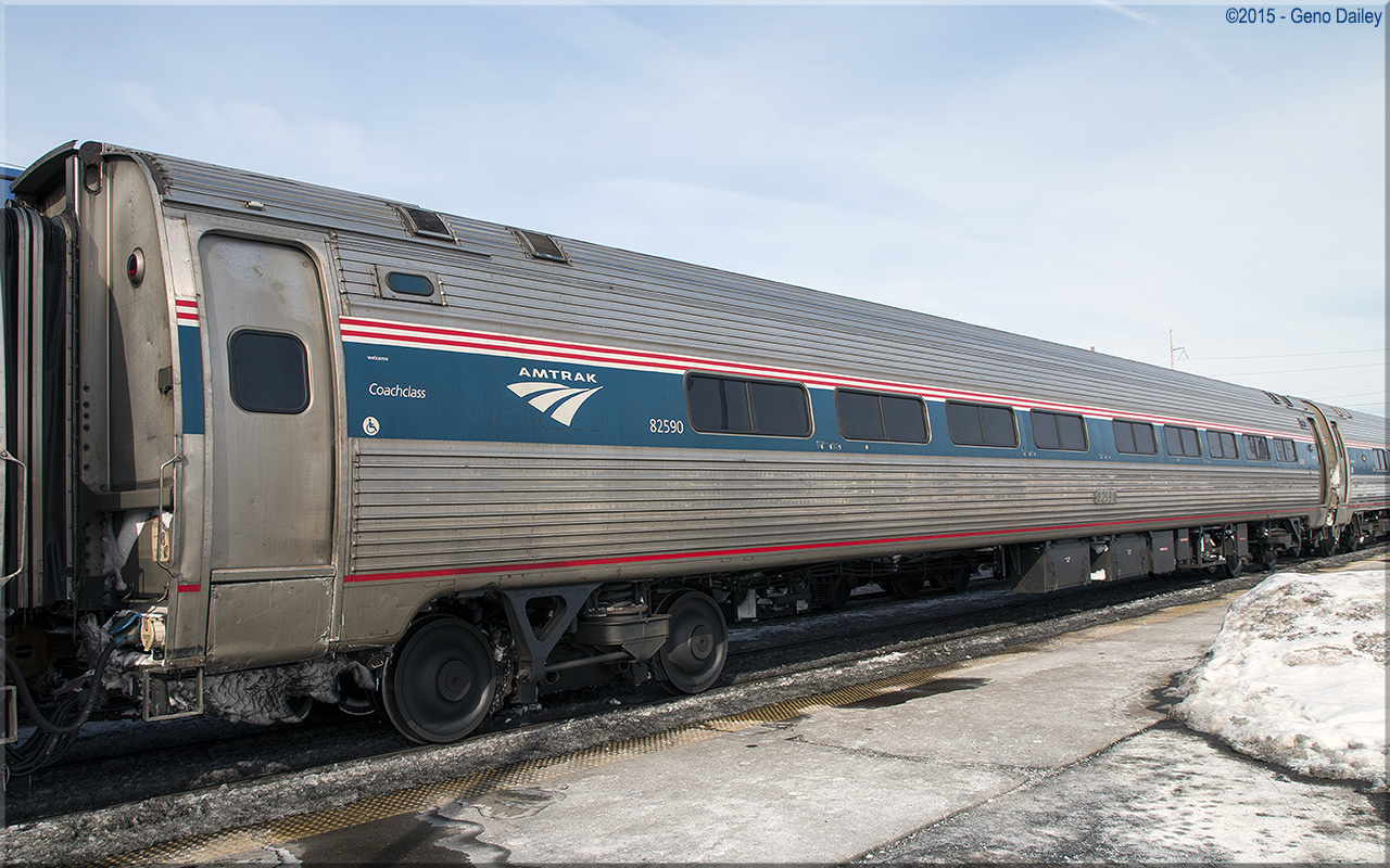 Built as a standard 84 seat coach in March 1977 and numbered 21261. Trainline-equipped for push-pull operation and converted to a Capstone car with 72 seats in October 2005 and renumbered 82590. Historical information about this car provided by www.amtrakbythenumbers.com. |