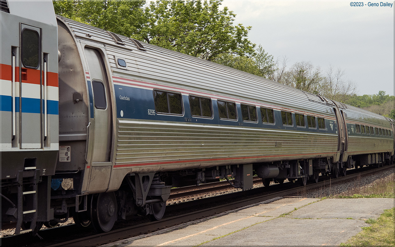 Built as a standard 84-seat coach in June 1975 and numbered 21014. Refurbished with an ADA-compliant restroom in August 1997 and renumbered 21650. Converted to a Capstone coach with 72 seats and trainline-equipped for push-pull operation in November 2005 and renumbered 82595. Historical information about this car provided by www.amtrakbythenumbers.com. |