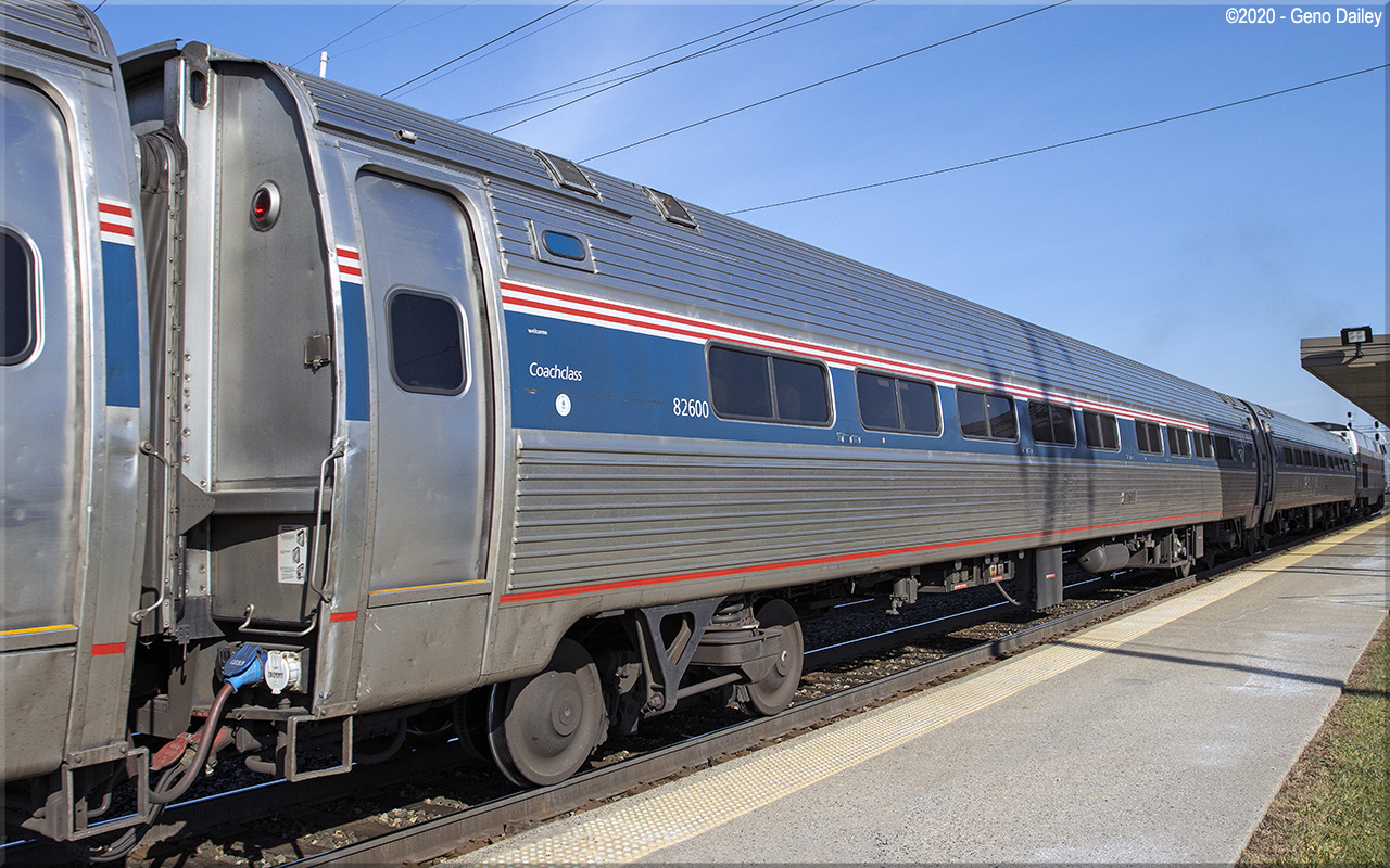 Built as a standard 84-seat coach February 1977 and numbered 21240. Refurbished with an ADA-compliant restroom in September 1997 and renumbered 21658. Trainline-equipped for push-pull operation and converted to a Capstone coach with 72 seats in December 2005 and renumbered 82600. Historical information about this car provided by www.amtrakbythenumbers.com. |