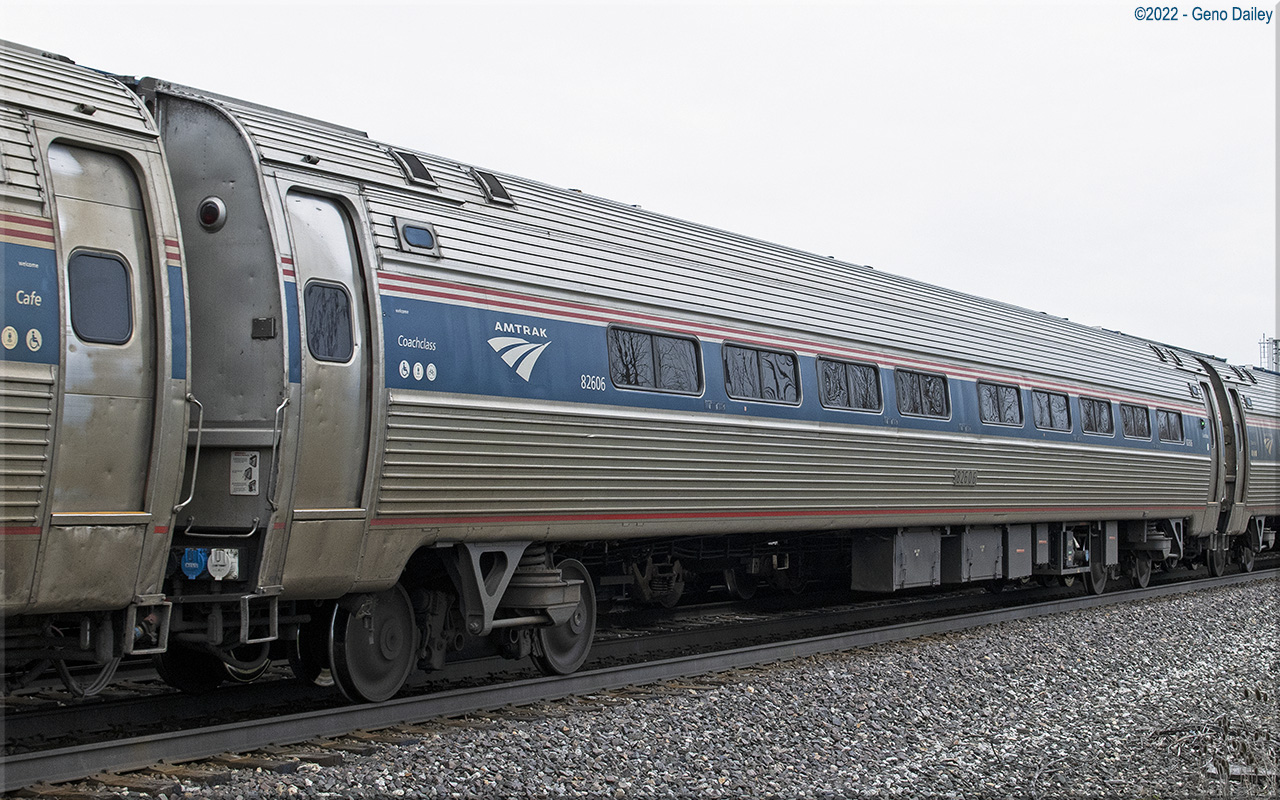 Built as a standard 84 seat coach in March 1977 and numbered 21257. Trainline-equipped for push-pull operation and converted to a Capstone coach with 72 seats in February 2006 and renumbered 82606. Historical information about this car provided by www.amtrakbythenumbers.com. |