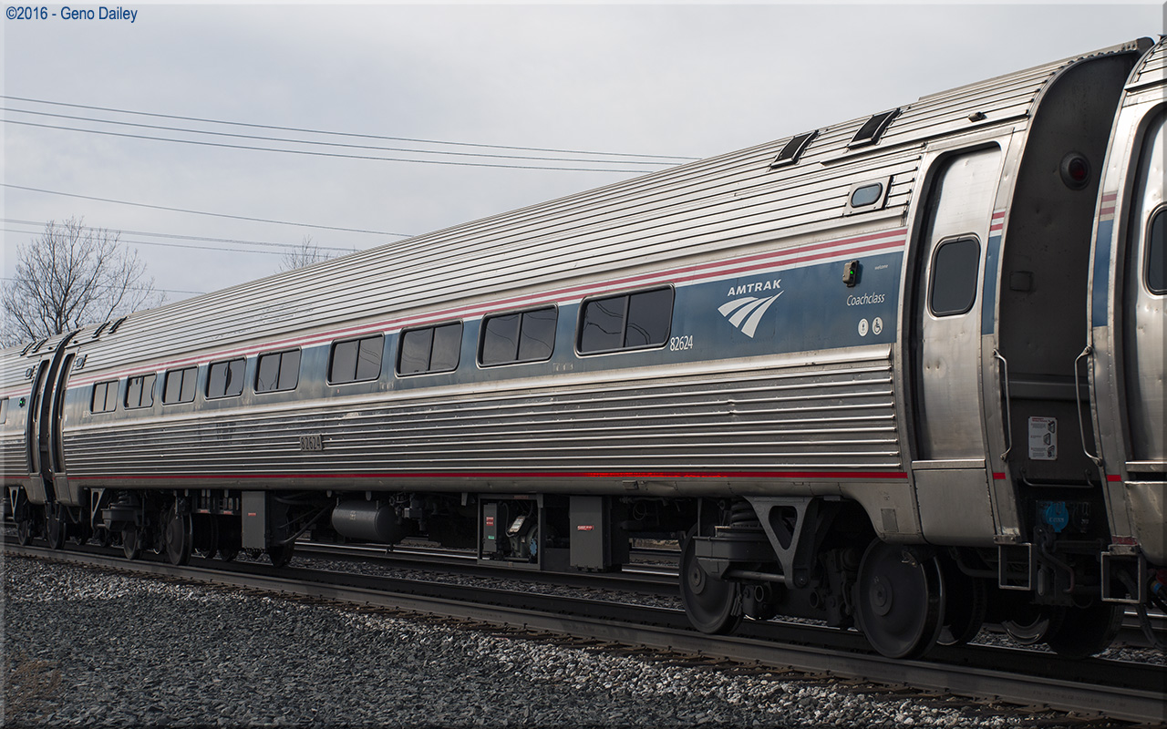Built as a long-distance coach with 60 seats and 2 dressing rooms in April 1977 and numbered 21864. Converted to a standard 84 seat coach in January 1989 and renumbered 21282. Converted to a Capstone car with 72 seats and trainline-equipped for push-pull operation in June 2006 and renumbered 82624. Historical information about this car provided by www.amtrakbythenumbers.com. |