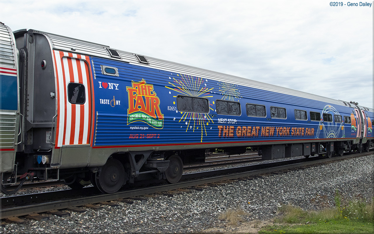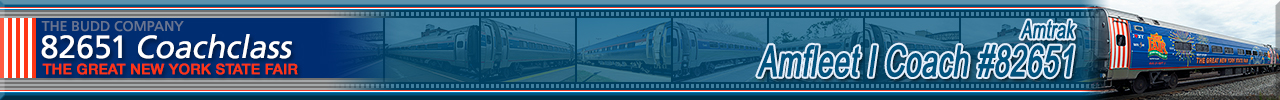 Built as a standard 84 seat coach in January 1977 and numbered 21237. Converted to a Capstone car with 72 seats in November 2001 and renumbered 82080. Trainline-equipped for push-pull operation in January 2007 and renumbered 82651. This photo taken when the car was wearing a special wrap promoting the New York State Fair in 2019. Historical information about this car provided by www.amtrakbythenumbers.com. |