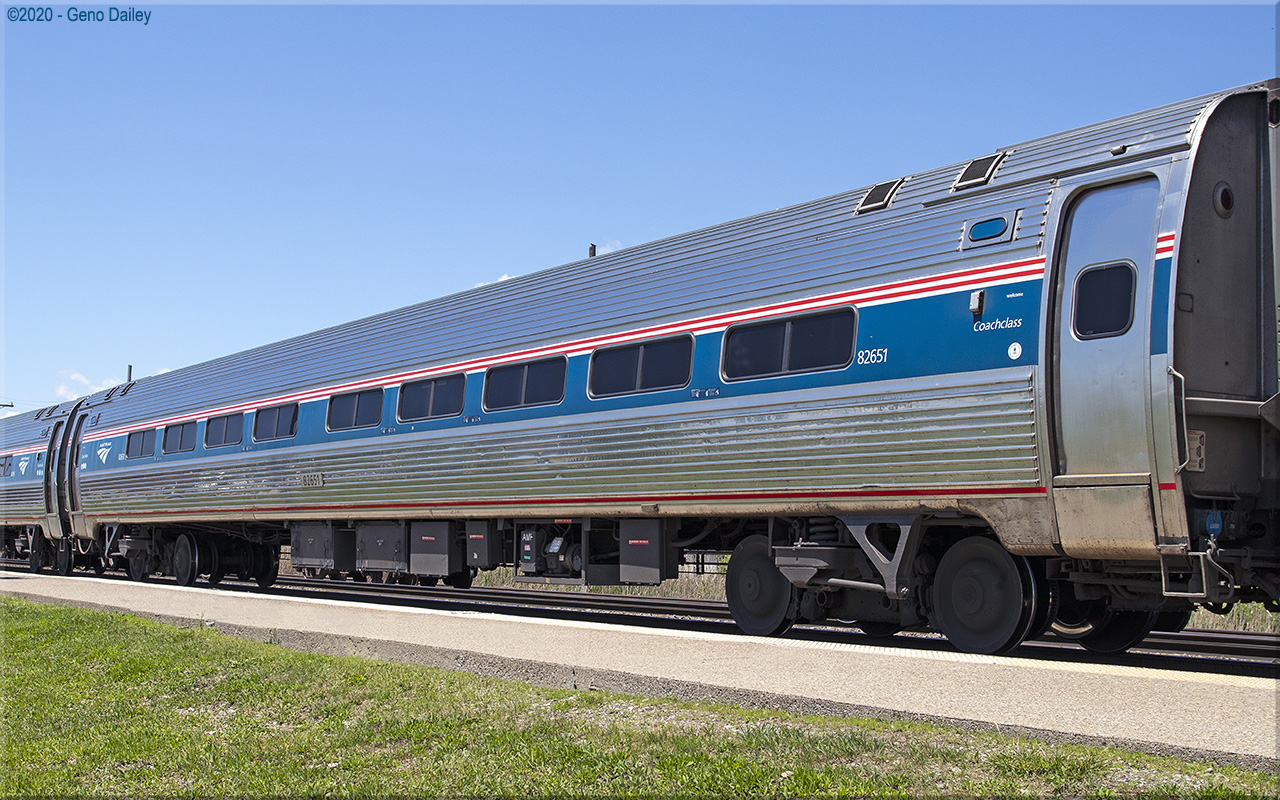 Built as a standard 84 seat coach in January 1977 and numbered 21237. Converted to a Capstone car with 72 seats in November 2001 and renumbered 82080. Trainline-equipped for push-pull operation in January 2007 and renumbered 82651. Historical information about this car provided by www.amtrakbythenumbers.com. |