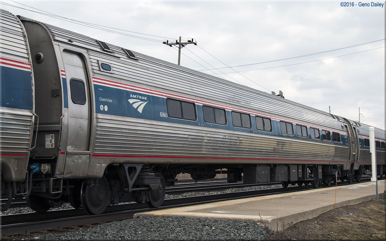 Built as a standard 84 seat coach in September 1975 and numbered 21031. Converted to a Capstone car with 72 seats in November 2001 and renumbered 82082. Trainline-equipped for push-pull operation in April 2007 and renumbered 82663. Historical information about this car provided by www.amtrakbythenumbers.com. |