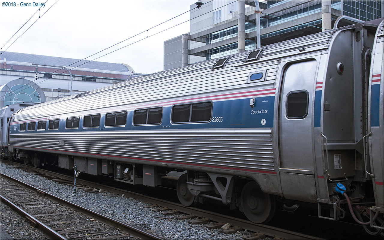Built as a standard 84 seat coach in January 1977 and numbered 21227. Trainline-equipped for push-pull operation in January 1989 and renumbered 44227. Converted into a Capstone car with 72 seats in July 2007 and renumbered 82665. Historical information about this car provided by www.amtrakbythenumbers.com. |