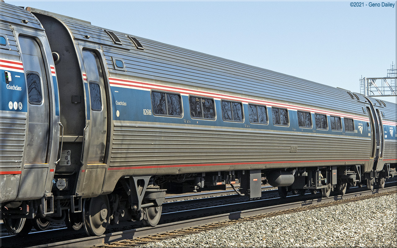 Built as a standard 84 seat coach in March 1977 and numbered 21253. Converted to a Capstone coach with 72 seats in July 1999 and renumbered 82010. Trainline-equipped for push-pull operation in May 2006 and renumbered 82686. Historical information about this car provided by www.amtrakbythenumbers.com. |