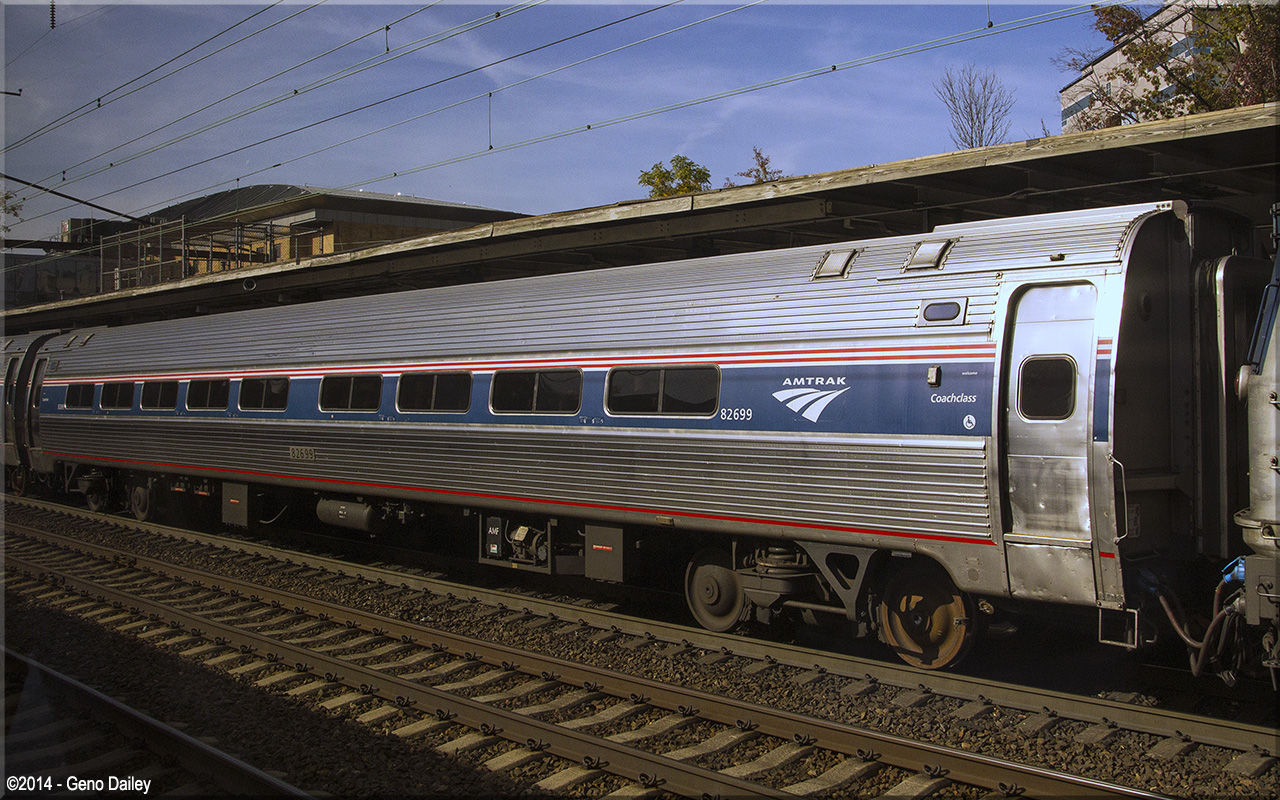 Built as a standard 84 seat coach in December 1975 and numbered 21085. Converted to a Capstone coach with 72 seats in September 1999 and renumbered 82018. Trainline-equipped for push-pull operation in January 2007 and renumbered 82699. Historical information about this car provided by www.amtrakbythenumbers.com. |