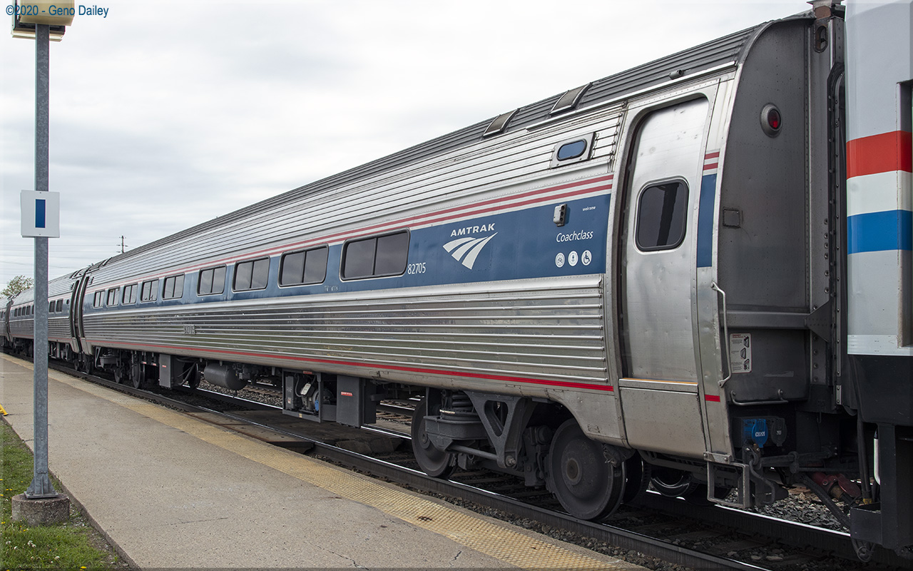 Built as a long-distance coach with 60 seats and two dressing rooms in October 1976 and numbered 21837. Trainline-equipped for push-pull operation in June 1987 and renumbered 44837. Converted to a Capstone coach with 72 seats in January 2008 and renumbered 82705. Historical information about this car provided by www.amtrakbythenumbers.com. |