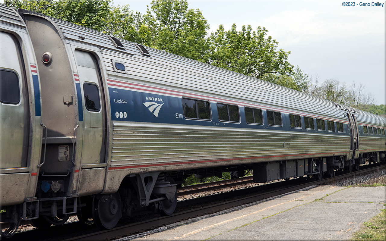 Built as a standard 84-seat coach in March 1976 and numbered 21130. Refurbished with an ADA-compliant restroom in November 1995 and renumbered 21616. Converted to a Capstone coach with 72 seats and trainline-equipped for push-pull operation in February 2008 and renumbered 82710. Historical information about this car provided by www.amtrakbythenumbers.com. |