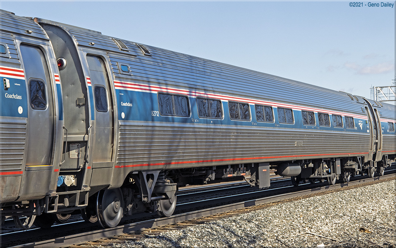 Built as a standard 84 seat coach in March 1977 and numbered 21157. Refurbished with ADA-compliant restrooms in November 1995 and renumbered 21615. Converted to a Capstone coach with 72 seats in February 2000 and renumbered 82040. Trainline-equipped for push-pull operation in February 2008 and renumbered 82712. Historical information about this car provided by www.amtrakbythenumbers.com. |