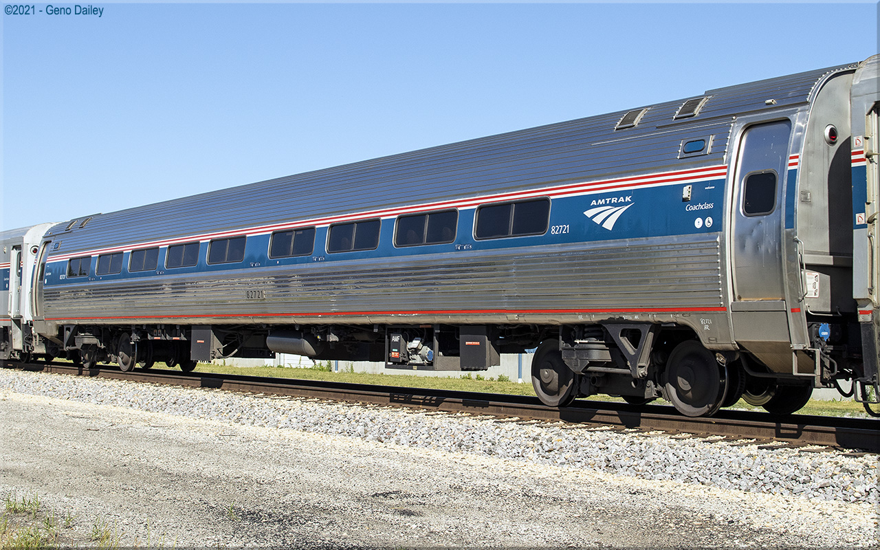 Built as a standard 84 seat coach in July 1976 and numbered 21180. Converted to a Capstone coach with 72 seats in February 2000 and renumbered 82038. Trainline-equipped for push-pull operation in April 2008 and renumbered 82721. Historical information about this car provided by www.amtrakbythenumbers.com. |