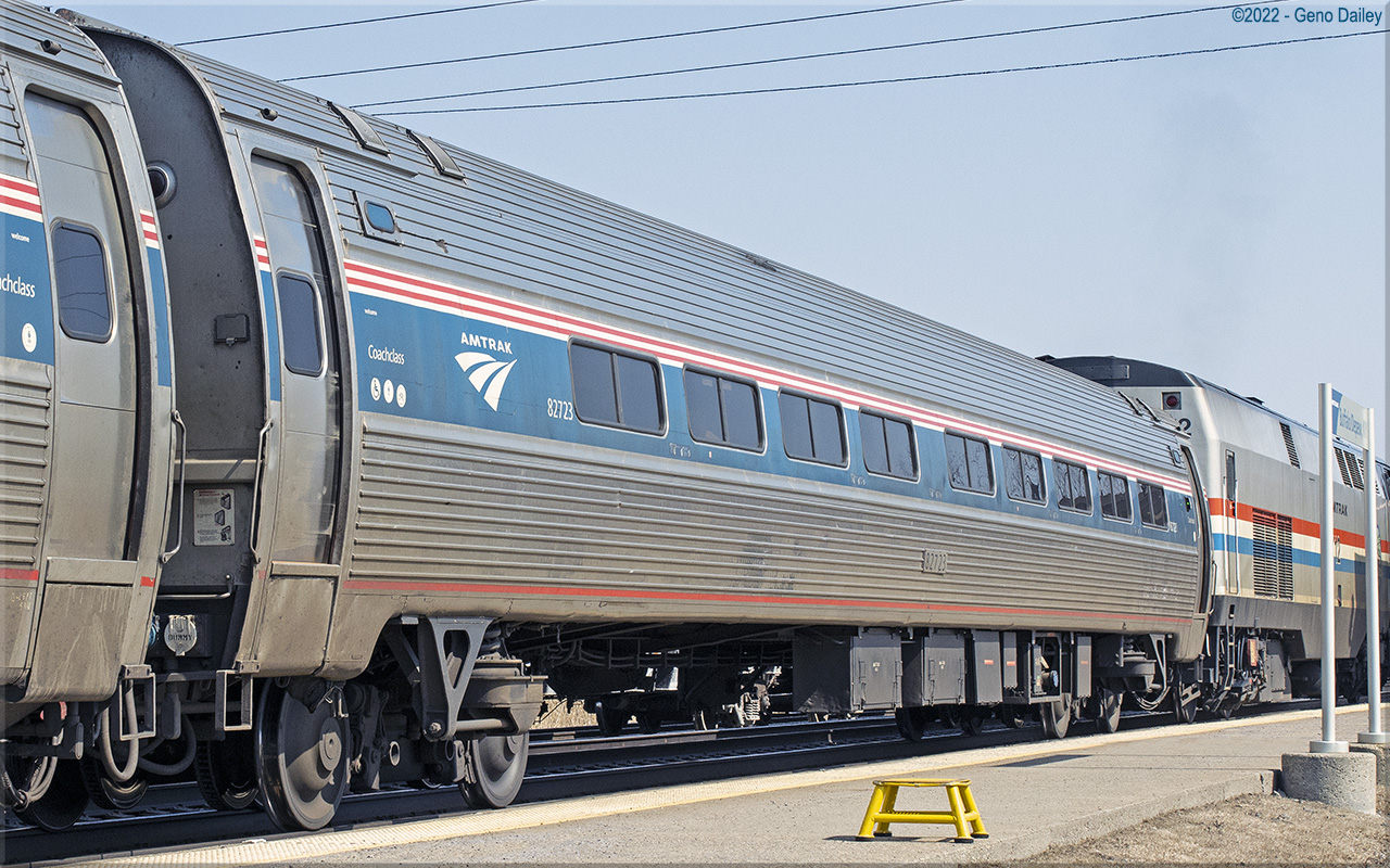 Built as a standard 84 seat coach in February 1976 and numbered 21110. Refurbished with ADA-compliant restrooms in December 1995 and renumbered 21620. Converted to a Capstone coach with 72 seats in February 2000 and renumbered 82043. Trainline-equipped for push-pull operation in April 2008 and renumbered 82723. Historical information about this car provided by www.amtrakbythenumbers.com. |