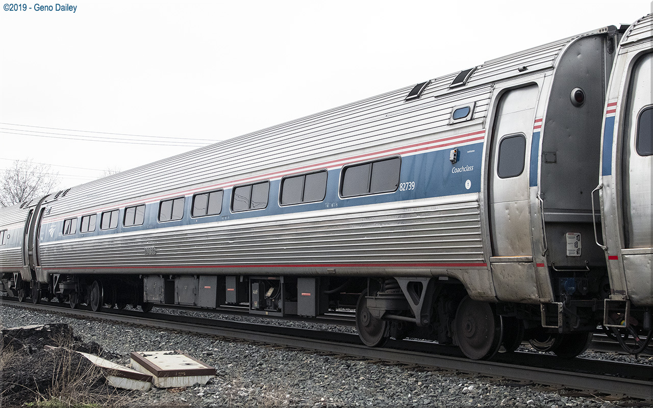 Built as a standard 84-seat coach in September 1975 and numbered 21030. Converted to a Capstone coach with 72 seats and trainline-equipped for push-pull operation in September 2008 and renumbered 82739. Historical information about this car provided by www.amtrakbythenumbers.com. |