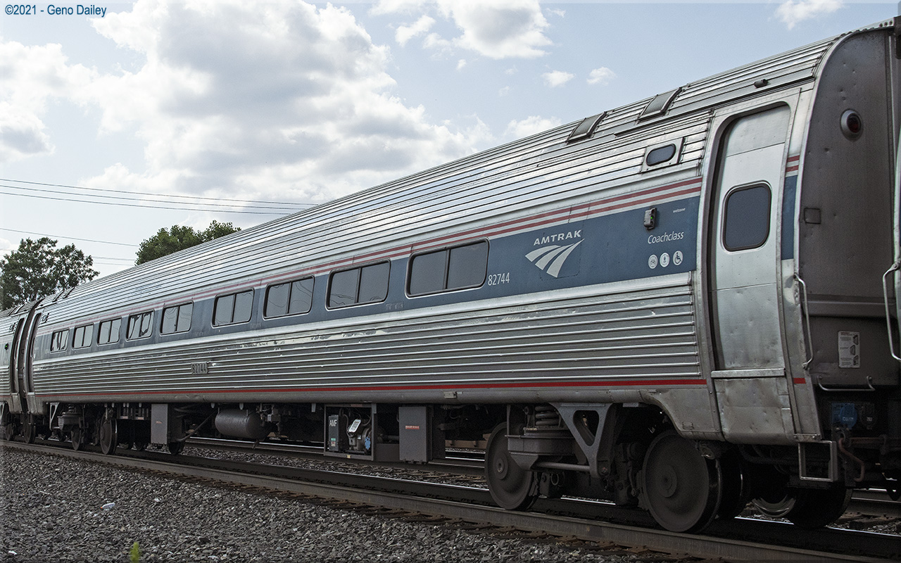 Built as a standard 84 seat coach in November 1975 and numbered 21060. Converted to a Capstone coach with 72 seats and trainline-equipped for push-pull operation in October 2008 and renumbered 82744. Historical information about this car provided by www.amtrakbythenumbers.com. |
