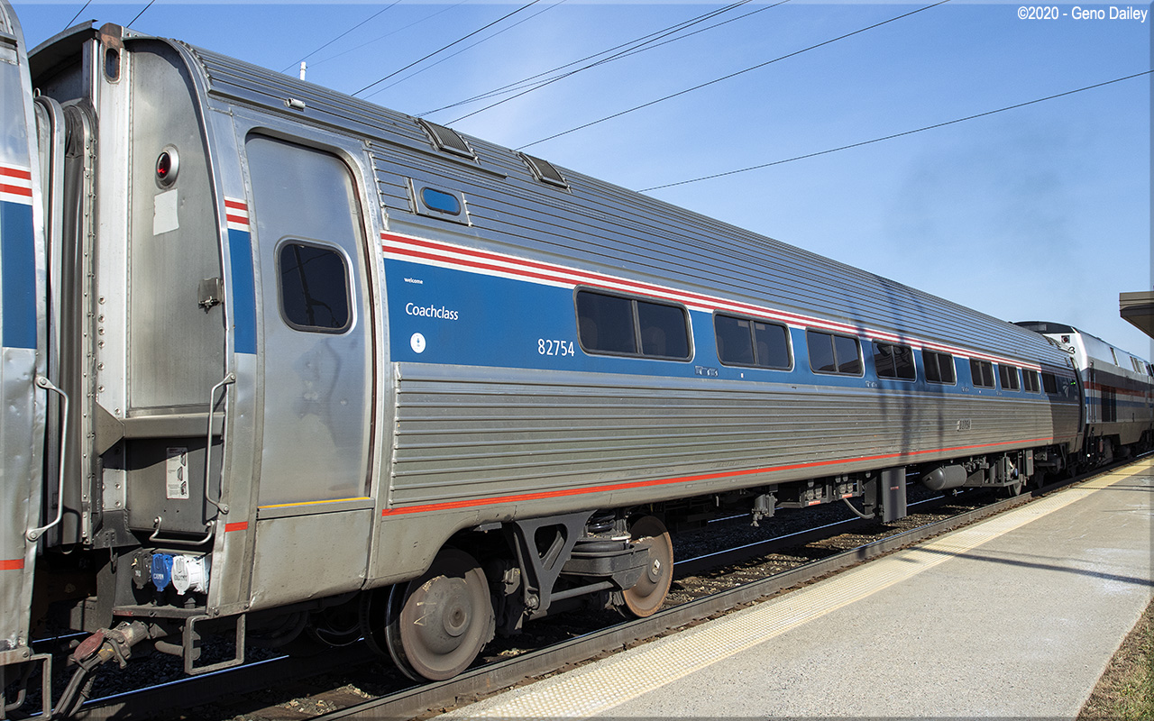 Built as a standard 84 seat coach in May 1975 and numbered 21002. Converted to a Capstone coach with 72 seats and trainline-equipped for push-pull operation in April 2009 and renumbered 82754. Historical information about this car provided by www.amtrakbythenumbers.com. |