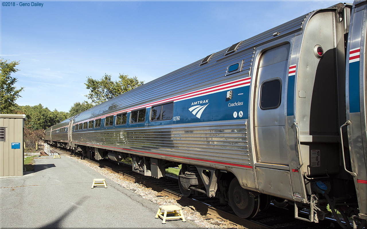 Built as a standard 84 seat coach in April 1976 and numbered 21140. Trainline-equipped for push-pull operation and converted into a Capstone car with 72 seats in May 2009 and renumbered 82760. Historical information about this car provided by www.amtrakbythenumbers.com. |