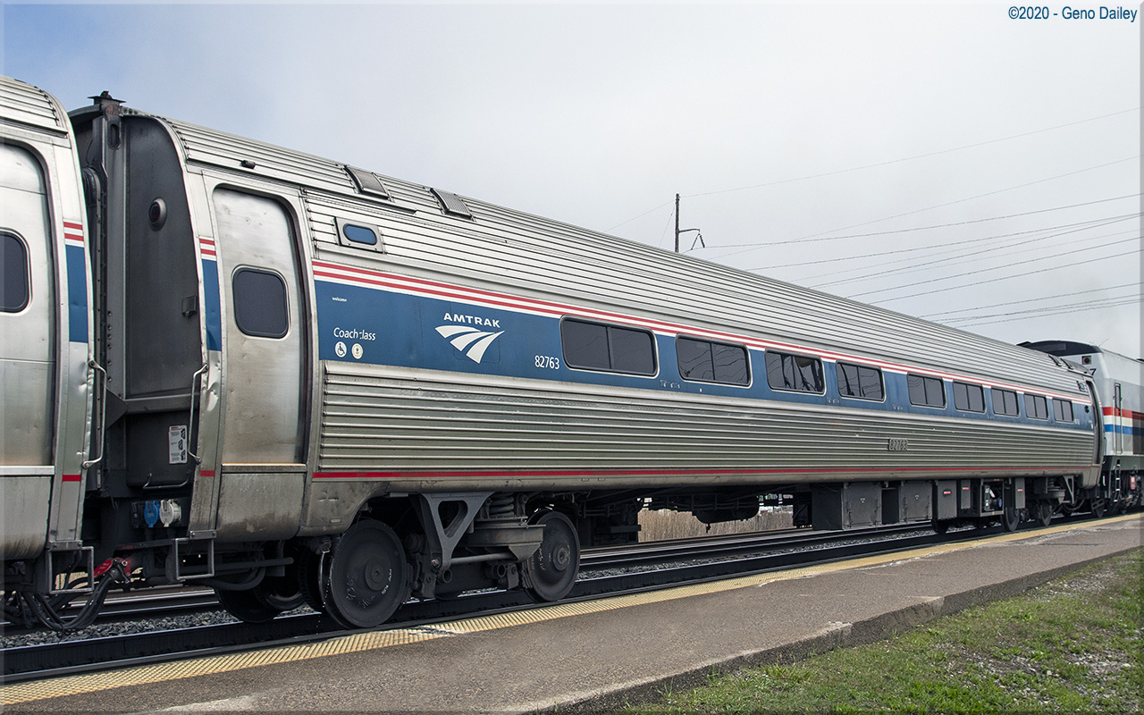 Built as a long-distance coach with 60 seats and two dressing rooms in October 1976 and numbered 21850. Refurbished for Metroliner Service in December 1983 and renumbered 21950. Refurbished with an ADA-compliant restroom in June 1996 and renumbered 21701. Converted to a Capstone coach with 72 seats and trainline-equipped for push-pull operation in August 2009 and renumbered 82763. Historical information about this car provided by www.amtrakbythenumbers.com. |