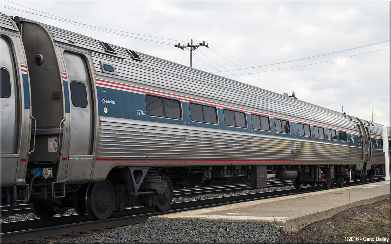 Built as a long-distance coach with 60 seats and 2 dressing rooms in April 1977 and numbered 21868. Refurbished for Metroliner service in November 1983 and renumbered 21968. Trainline-equipped for push-pull operation in May 1990 and renumbered 44968. Converted to a Capstone car with 72 seats in August 2009 and renumbered 82767. Historical information about this car provided by www.amtrakbythenumbers.com. |