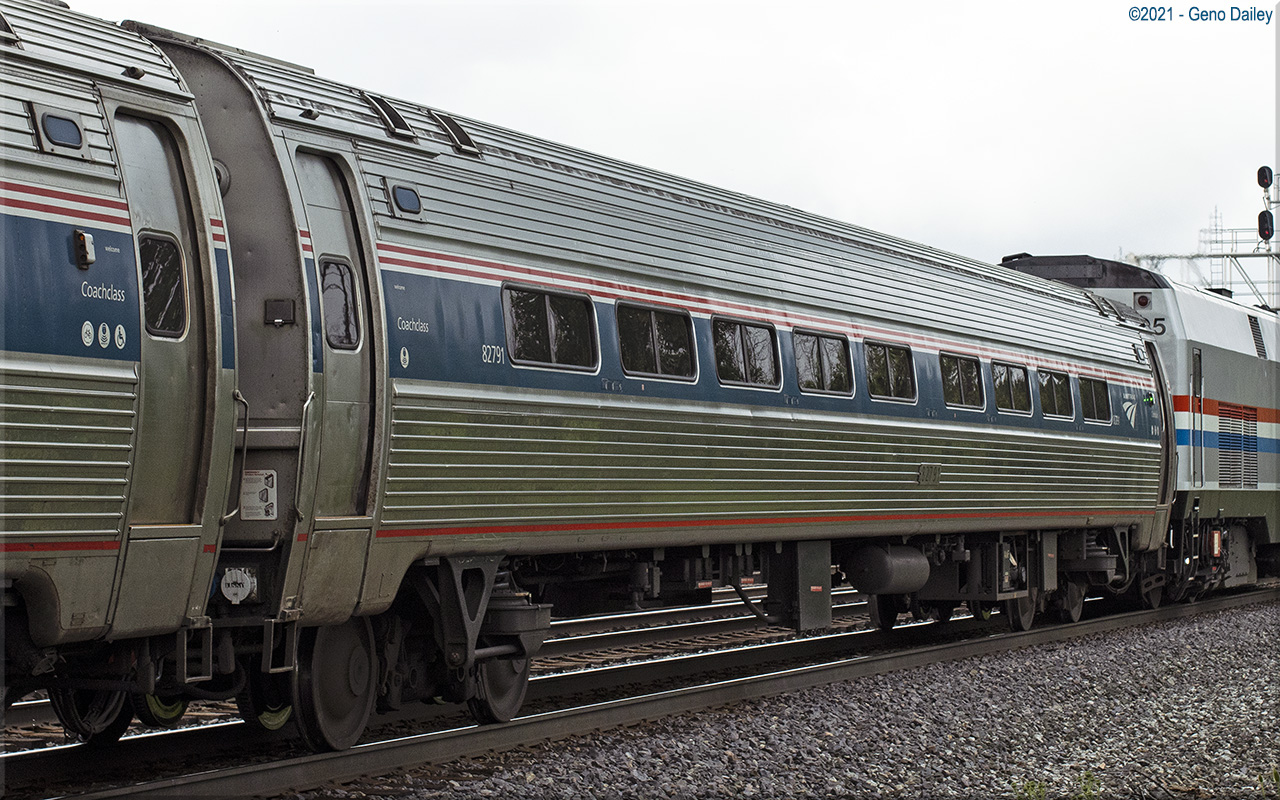 Built as a standard 84 seat coach in February 1976 and numbered 21112. Converted to a Capstone coach with 72 seats and trainline-equipped for push-pull operation in May 2010 and renumbered 82791. Historical information about this car provided by www.amtrakbythenumbers.com. |