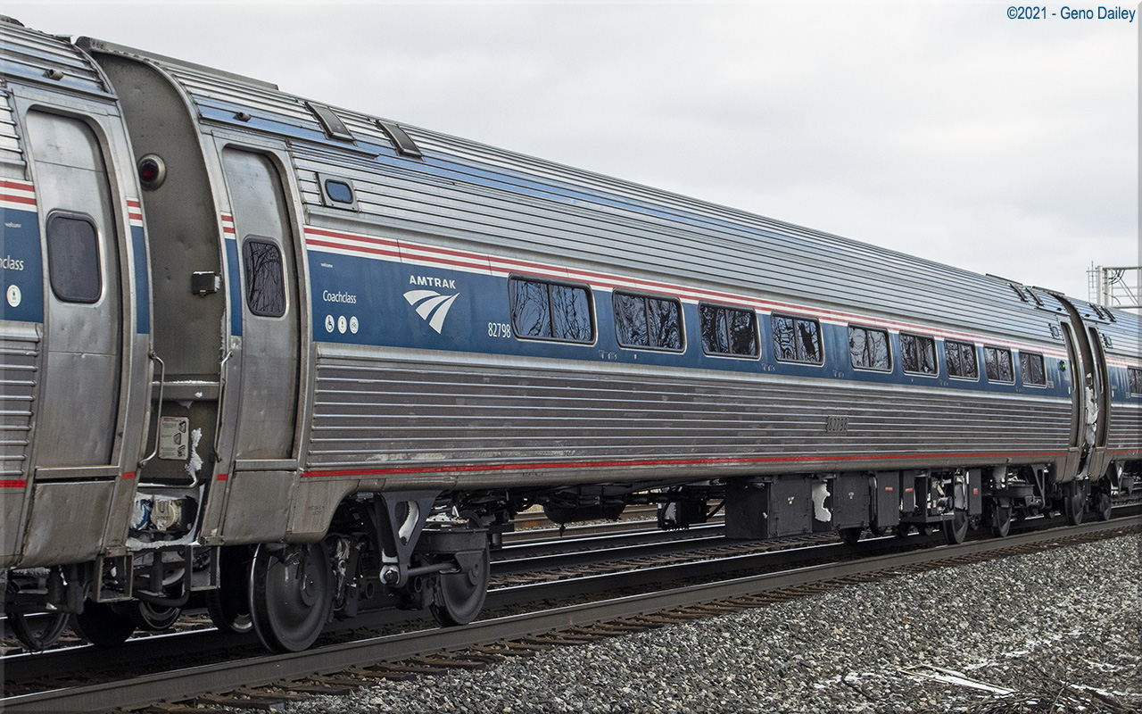 Built as a standard 84 seat coach in March 1976 and numbered 21124. Trainline-equipped for push-pull operation and converted to a Capstone coach with 72 seats in August 2010 and renumbered 82798. Historical information about this car provided by www.amtrakbythenumbers.com. |