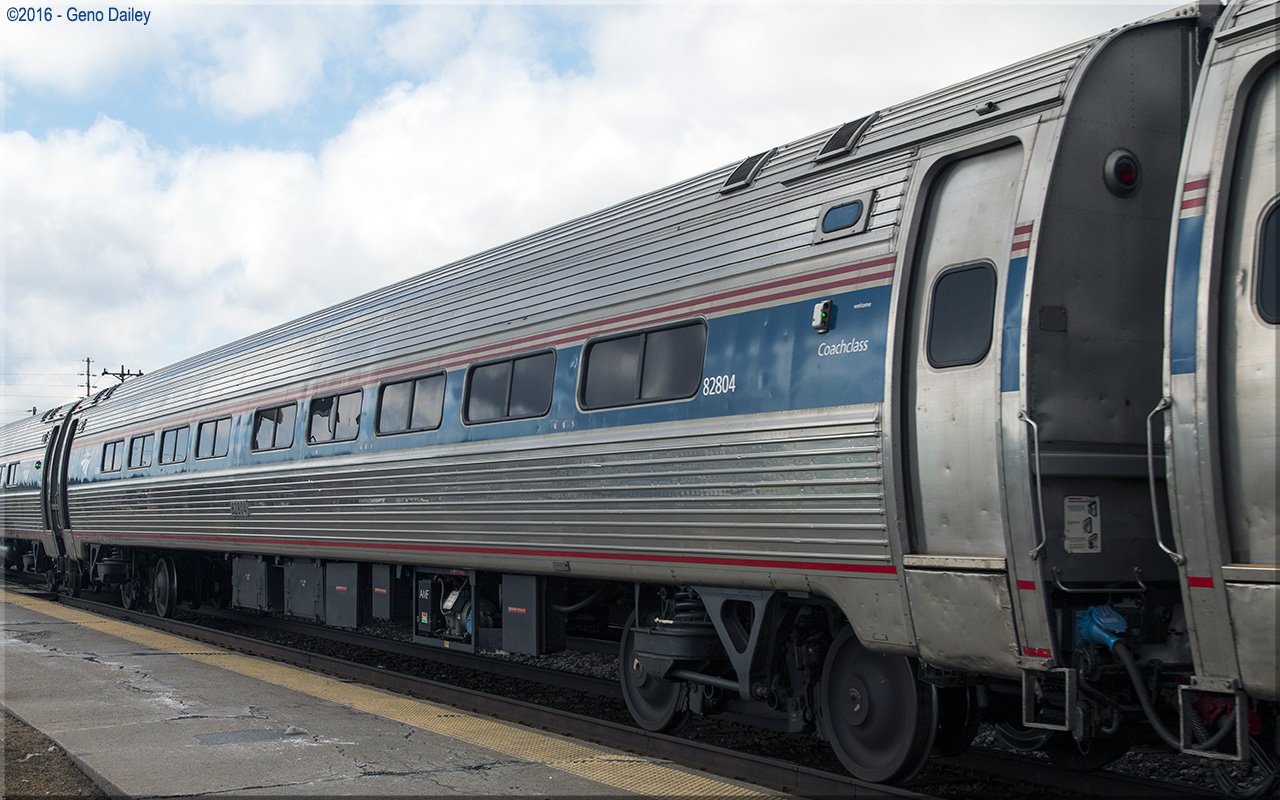 Built as a standard 84 seat coach in March 1977 and numbered 21258. Converted to a Capstone car with 72 seats in November 1999 and renumbered 82025. Trainline-equipped for push-pull operation in October 2011 and renumbered 82804. Historical information about this car provided by www.amtrakbythenumbers.com. |