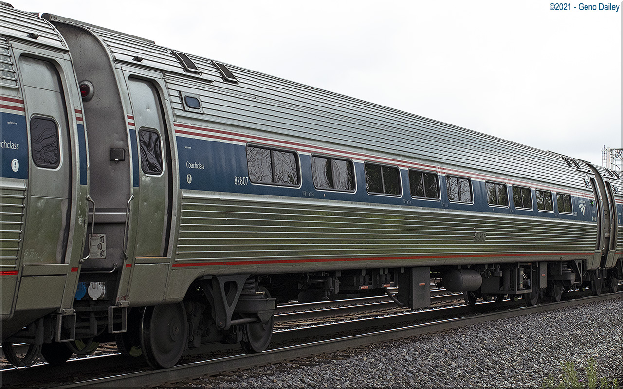 Built as a standard 84 seat coach in January 1977 and numbered 21225. Converted to a Capstone coach with 72 seats in October 1999 and renumbered 82022. Trainline-equipped for push-pull operation in December 2011 and renumbered 82807. Historical information about this car provided by www.amtrakbythenumbers.com. |