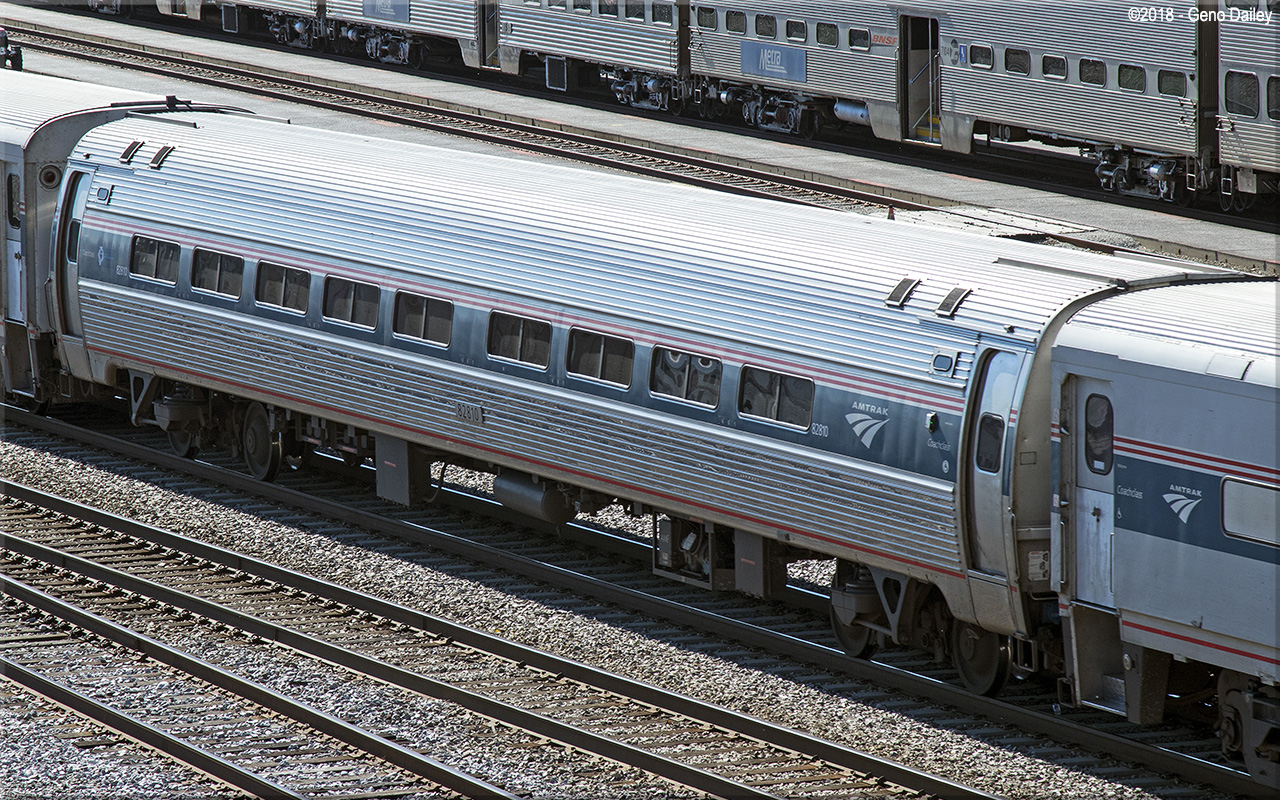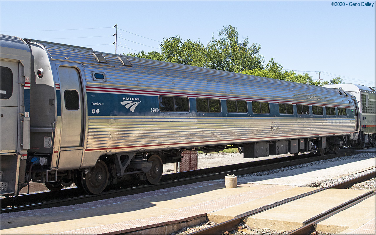 Built as a standard 84 seat coach in January 1977 and numbered 21232. Rebuilt with ADA-compliant restrooms in June 1996 and renumbered 21655. Converted to a Capstone car with 72 seats in August 2000 and renumbered 82071. Trainline-equipped for push-pull operation in July 2012 and renumbered 82810. This photo shows the car lettered for "Illinois High Speed Rail". Historical information about this car provided by www.amtrakbythenumbers.com. |