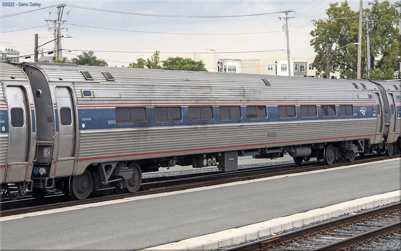 Built as an Amclub with 18 club seats, snack bar and 23 coach seats in March 1976 and numbered 20128. Converted to a Capstone cafe car with nominal seating in September 2000 and renumbered 85002. Converted to a Capstone coach with 72 seats and trainline-equipped for push-pull operation in February 2018 and renumbered 82973. Historical information about this car provided by www.amtrakbythenumbers.com. |