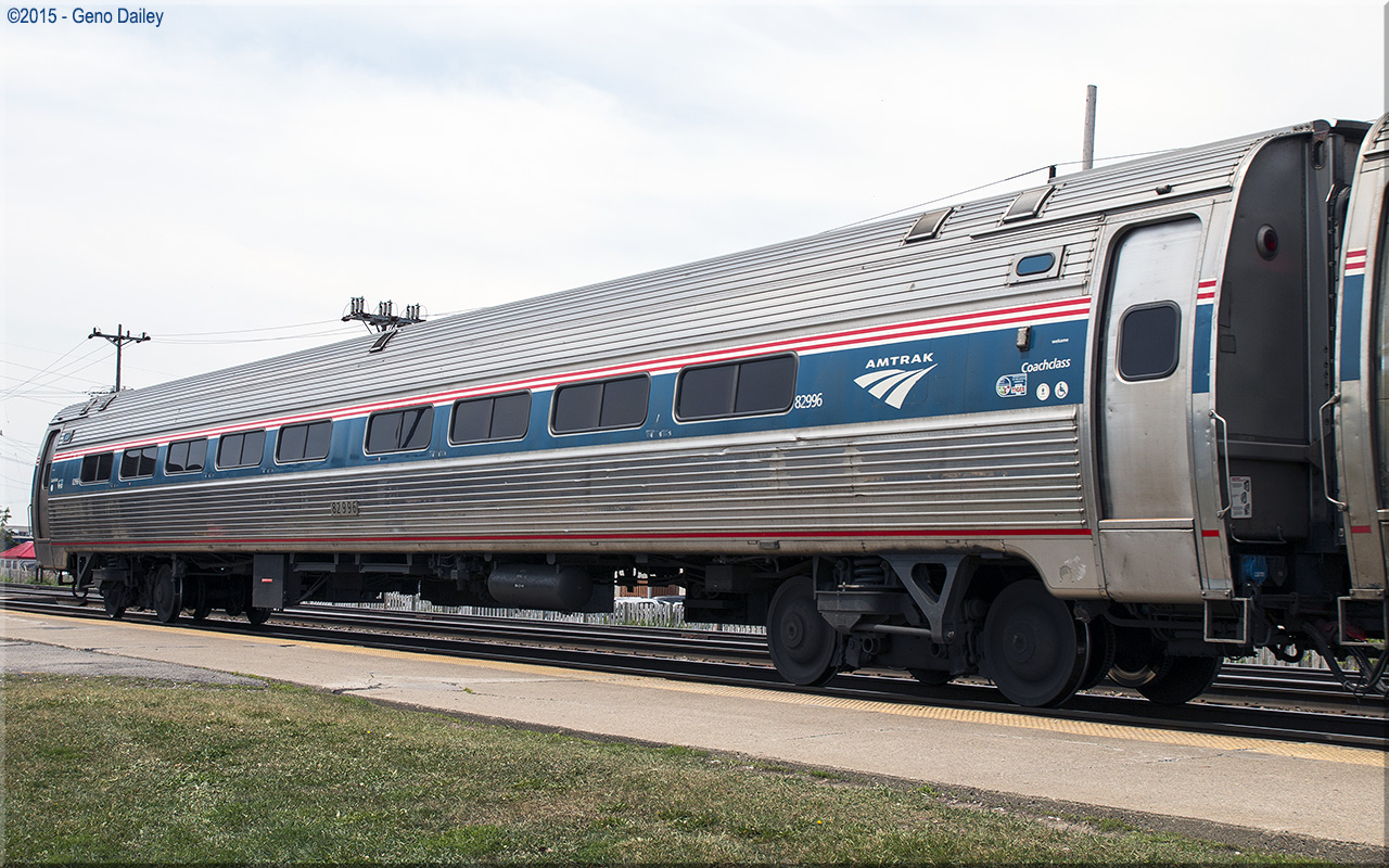 Built as an Amdinette with 8 four-place booths, snack bar and 23 coach seats in November 1976 and numbered 20221. Trainline-equipped for push-pull operation in October 1988 and renumbered 48221. Set up as an all-table dinette (date unknown) but renumbered 43353 in April 2003. Converted to a Capstone coach with 72 seats using American Recovery & Reinvestment Act (Economic Stimulus) Funds in May 2011 and renumbered 82996. Historical information about this car provided by www.amtrakbythenumbers.com. |