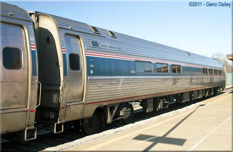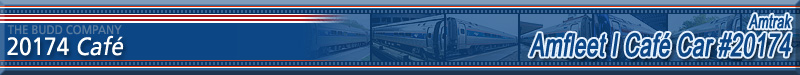 Built in January 1976 as an Amcafe with 51 coach seats total on either side of the snack bar and numbered 20013. Converted to a Club-Dinette in July 2004 and renumbered 20174. Information about the history of this car provided by www.amtrakbythenumbers.com.