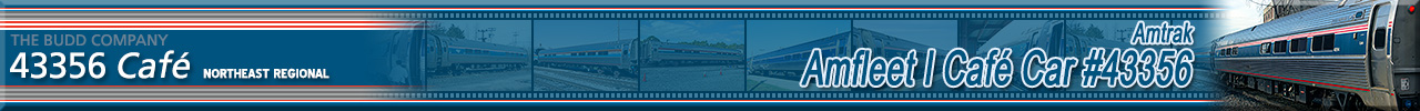 Built as an Amdinette with 8 four-place booths, snack bar and 23 coach seats in September 1976 and numbered 20216. Refurbished for Metroliner Service in November 1983 and renumbered 20916. Trainline-equipped for push-pull operation in March 1991 and renumbered 48916. Now configured with 14 four-place booths as an all-table car. Renumbered 43356 in December 2004. Historical information about this car provided by www.amtrakbythenumbers.com. |