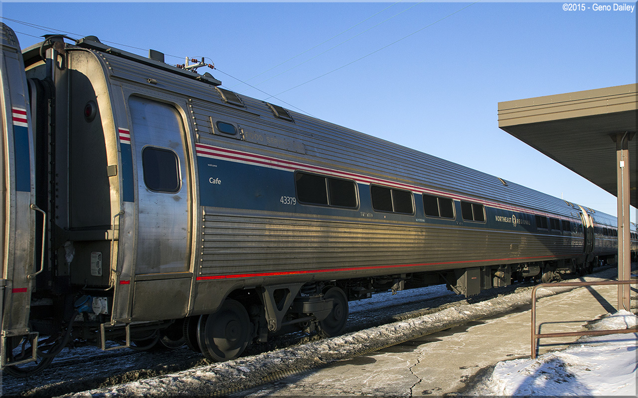 Built as an Amdinette with 8 four-place booths, snack bar and 23 coach seats in August 1976 and numbered 20212. Refurbished for Metroliner Service in November 1983 and renumbered 20912. Trainline-equipped for push-pull operation in September 2004 and renumbered 43379. Now configured as an all-table car with 14 four-place booths. Historical information about this car provided by www.amtrakbythenumbers.com. |