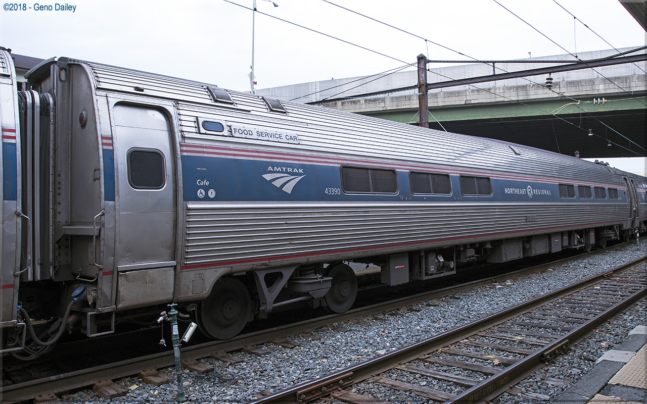 Built as an Amclub with 18 club seats, snack bar and 23 coach seats in November 1975 and numbered 20111. Refurbished for Amtrak's "Inter-American" train with 8 four-place booths, snack bar and 17 lounge seats sometime between 1980 and 1981 and renumbered 28305. Refurbished with 14 four-seat booths and trainline-equipped for push-pull operation in April 2010 and renumbered 43390. Historical information about this car provided by www.amtrakbythenumbers.com. |