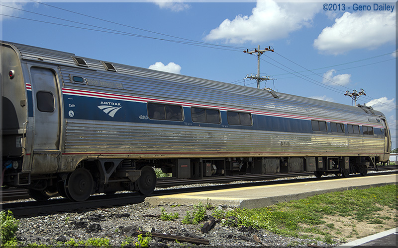 Built in October 1976 with 18 club seats, snack bar and 23 coach seats and numbered 20140. Trainline-equipped for push-pull service in November 1997 with the 23 coach seats removed and replaced with 6 four-place booths as well as renumbered 48140. Information about the history of this car provided by www.amtrakbythenumbers.com.
