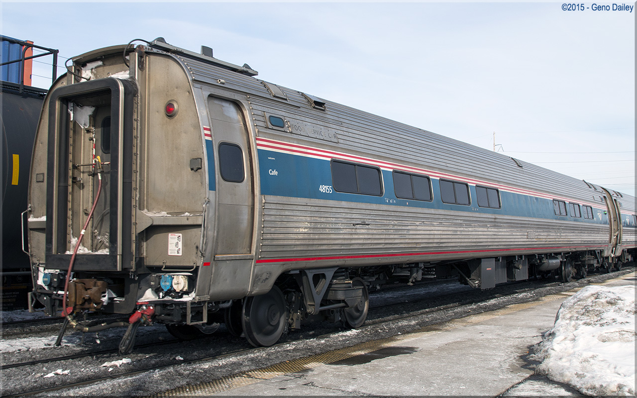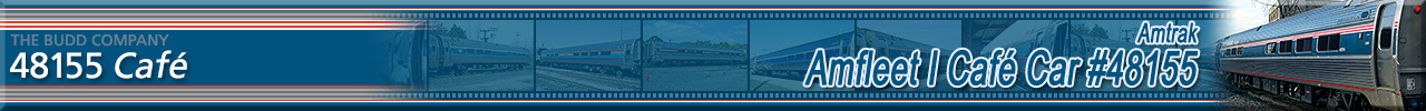 Built as an Amclub with 18 club seats, snack bar, and 23 coach seats in December 1975 and numbered 20122. Trainline-equipped for push-pull operation in April 1989 and renumbered 48122. Converted to a Club-Dinette with 18 club seats and 6 four-place booths in June 1995 and renumbered 48155. Historical information about this car provided by www.amtrakbythenumbers.com. |