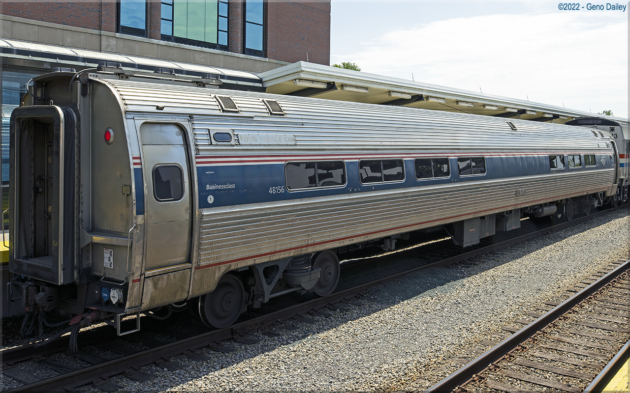 Built as an Amclub with 18 club seats, snack bar and 23 coach seats in February 1976 and numbered 20125. Trainline-equipped for push-pull operation in June 1989 and renumbered 48125. Converted to a Club-Dinette with 18 club seats and 6 four-place booths in July 1995 and renumbered 48156. Historical information about this car provided by www.amtrakbythenumbers.com. |