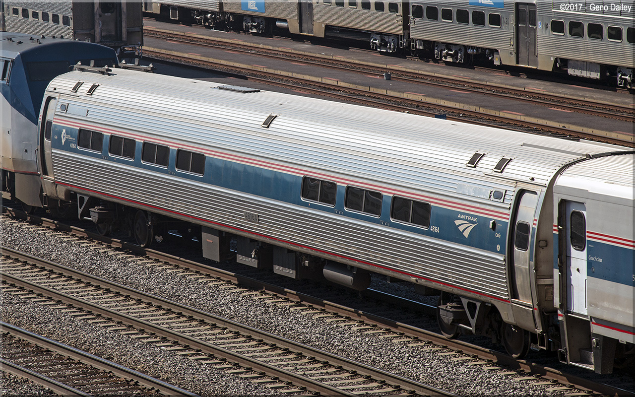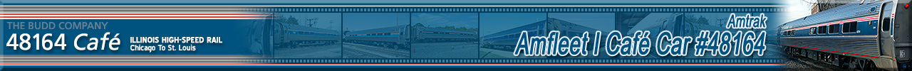 Built as an Amcafe with 51 coach seats on either side of the snack bar in August 1975 and numbered 20004. Trainline-equipped for push-pull operation in November 1988 and renumbered 43004. Converted to a Club-Dinette with 18 club seats and 6 four-place booths in April 2004 and renumbered 48164. Historical information about this car provided by www.amtrakbythenumbers.com. |
