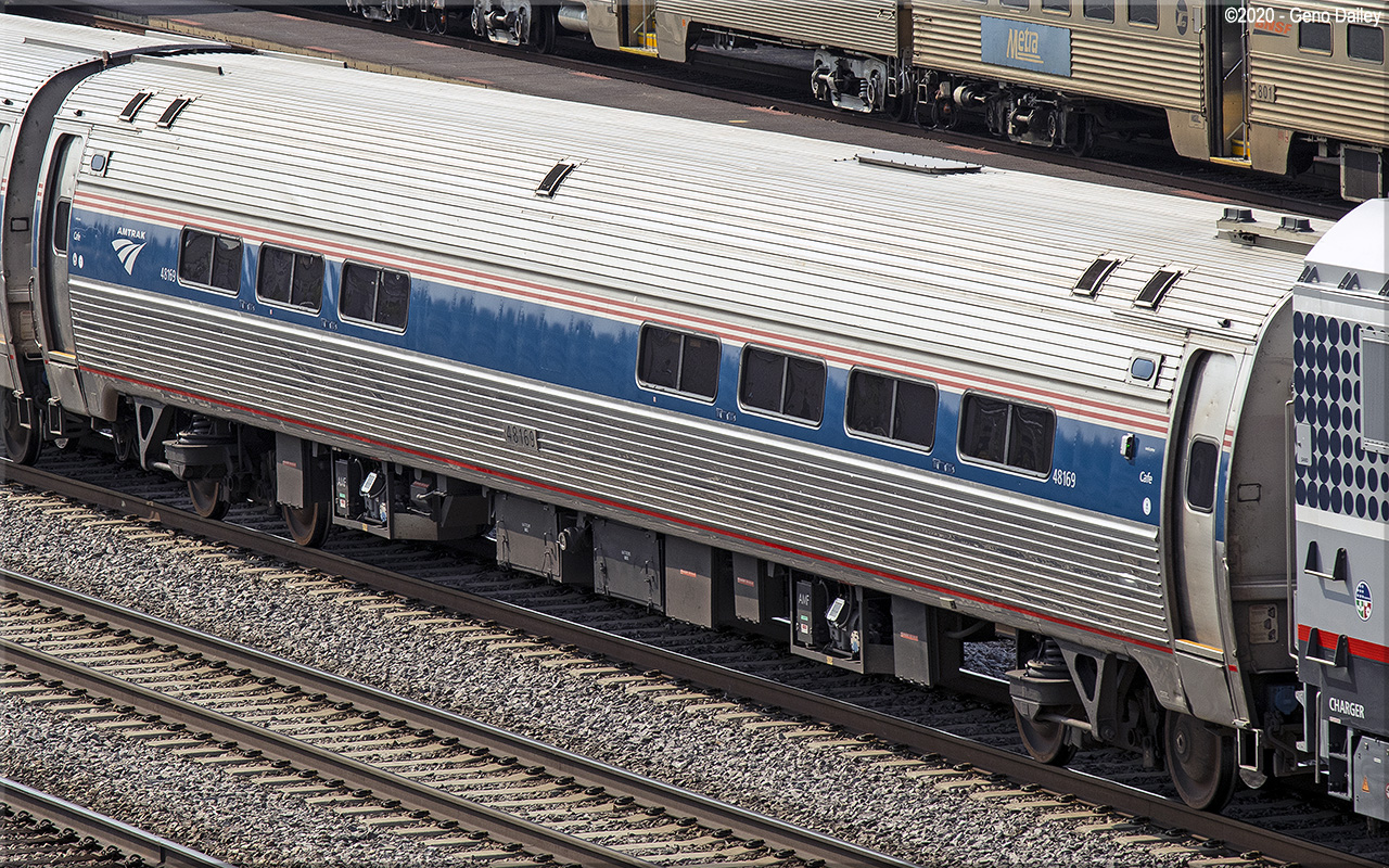 Built as an Amcafe with 51 coach seats on either side of the snack bar in January 1977 and numbered 20043. Trainline-equipped for push-pull operation in January 1988 and renumbered 43043. Converted to a Club-Dinette with 18 club seats and 6 four-place booths in June 2004 and renumbered 48169. Historical information about this car provided by www.amtrakbythenumbers.com. |
