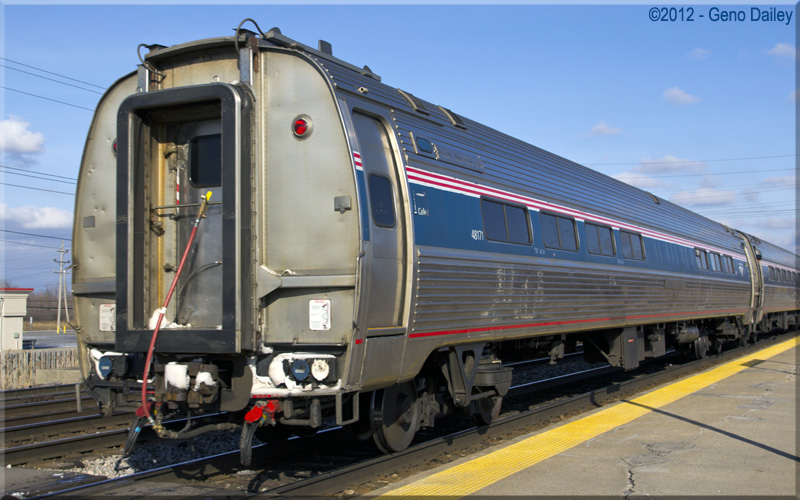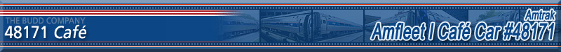 Built in July 1975 as an Amcafe with 51 coach seats on either side of the snack bar and numbered 20002. Trainline-equipped for push-pull service in July 1986 and renumbered 43002. Coach seats removed and replaced with 18 club seats and 6 four-place booths in June 2004 and renumbered 48171. This car also operated on the west coast and at one time was named "City of San Clemente" as evidenced by the large stainless steel plate above the numberboard in the center of the car. Information about the history of this car provided by www.amtrakbythenumbers.com. |