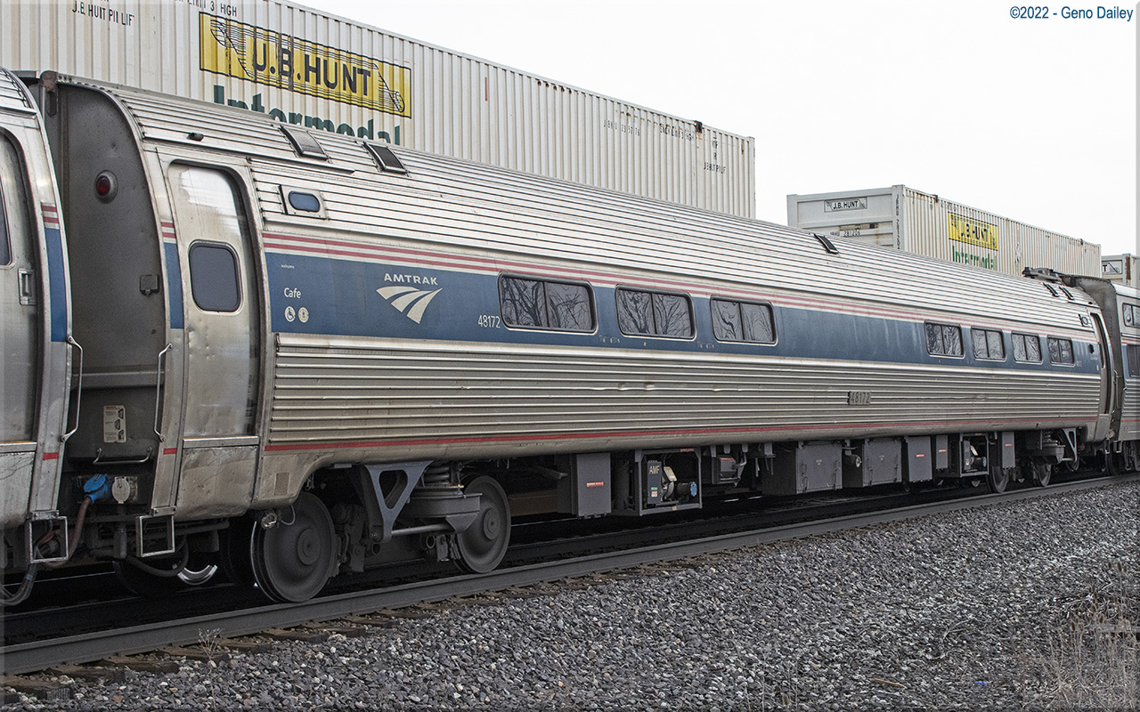 Built as an Amcafe with 51 coach seats on either side of the snack bar in February 1977 and numbered 20047. Converted to a Club-Dinette with 18 club seats and 6 four-place booths, also trainline-equipped for push-pull operation in June 2004 and renumbered 48172. Historical information about this car provided by www.amtrakbythenumbers.com. |