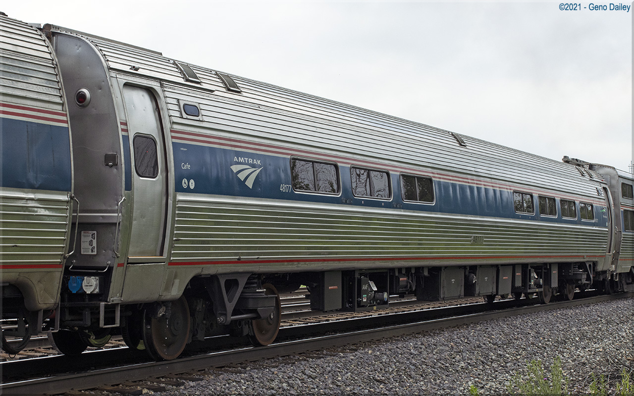 Built as an Amcafe with 51 coach seats on either side of the snack bar in November 1976 and numbered 20038. Converted to a Club-Dinette with 18 club seats and 6 four-place booths as well as trainline-equipped for push-pull operation in August 2007 and renumbered 48177. Historical information about this car provided by www.amtrakbythenumbers.com. |