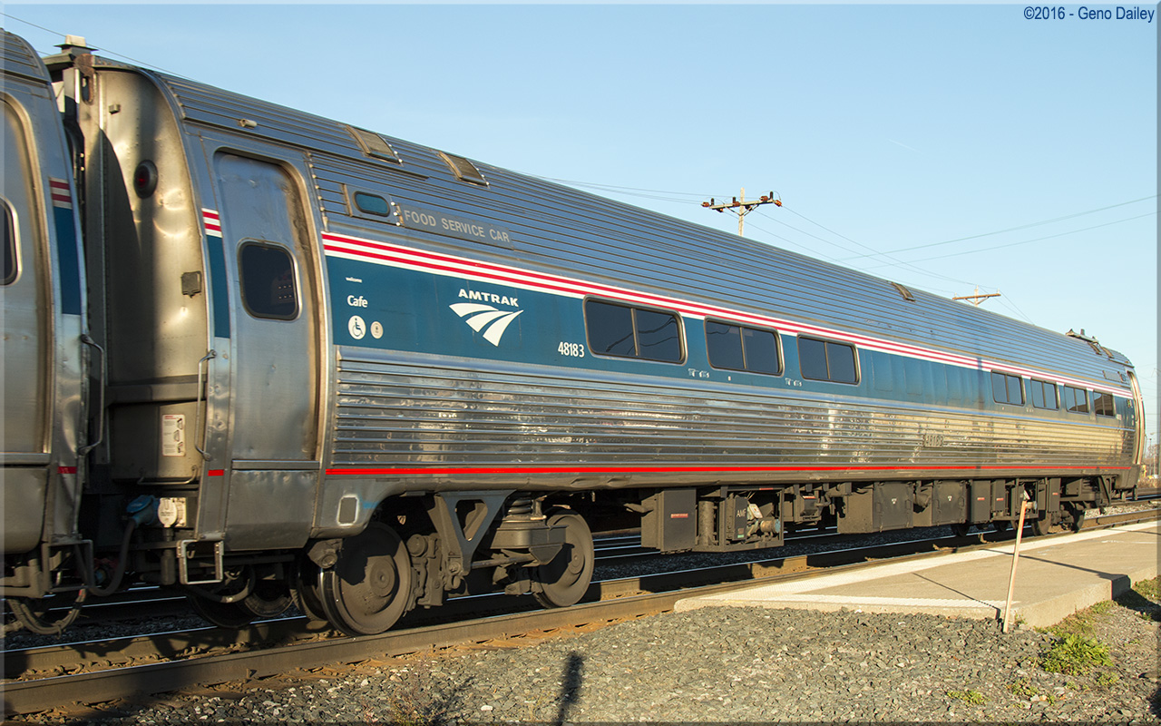 Built as an Amclub with 18 club seats, snack bar, and 23 coach seats in September 1976 and numbered 20139. Trainline-equipped for push-pull operation and equipped with 18 club seats and 6 four-place booths in November 2004 and renumbered 48183. Historical information about this car provided by www.amtrakbythenumbers.com. |