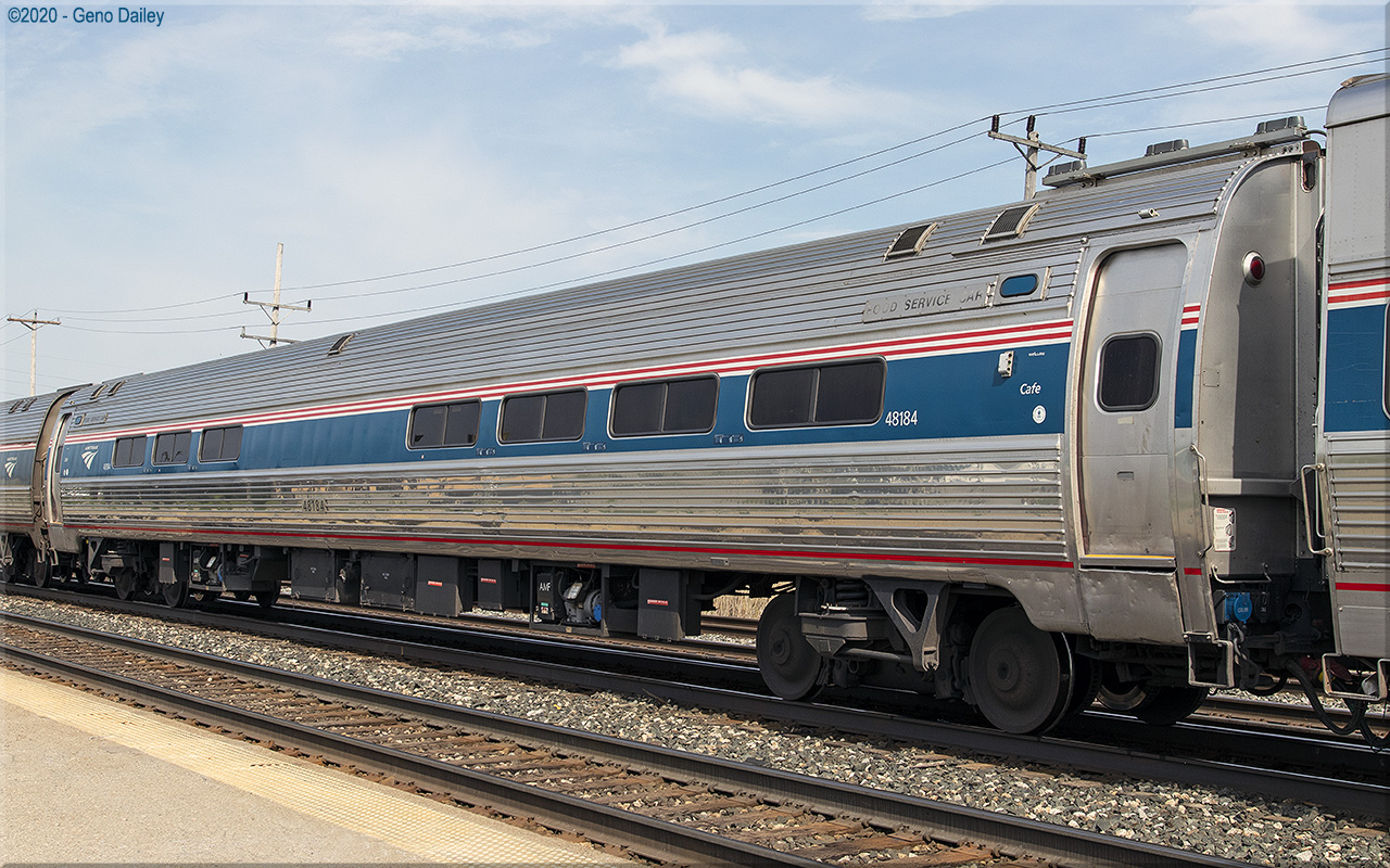 Built as an Amcafe with 51 coach seats on either side of the snack bar in August 1975 and numbered 20003. Converted to an Amdinette with 8 four-place booths, snack bar and 23 coach seats in September 2003 and renumbered 20252. Converted to a Club-Dinette with 18 club seats and 6 four-place booths as well as trainline-equipped for push-pull operation in November 2004 and renumbered 48184. Historical information about this car provided by www.amtrakbythenumbers.com. |