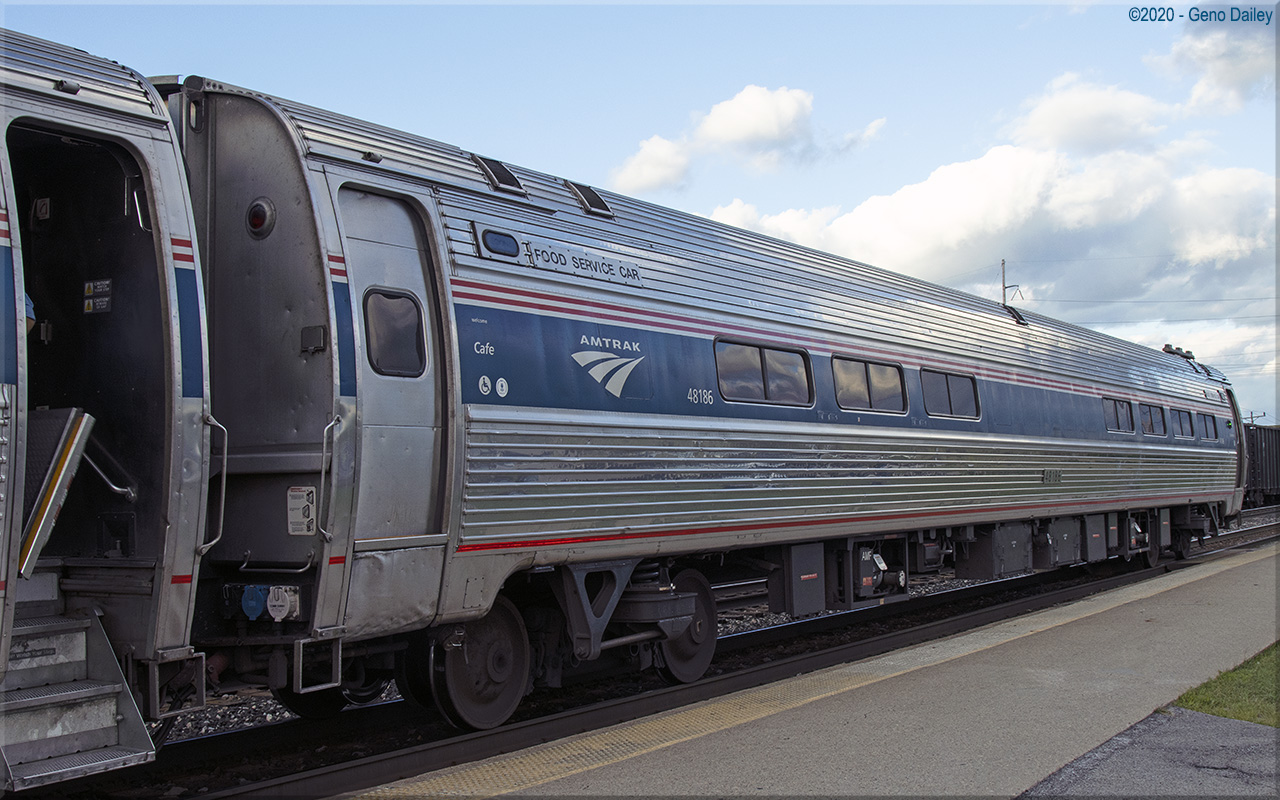 Built as an Amclub with 18 club seats, snack bar, and 23 coach seats in May 1976 and numbered 20132. Refurbished for Metroliner Service and trainline-equipped for push-pull operation in February 1997 and renumbered 48986. Converted to a Club-Dinette with 18 club seats and 6 four-place booths in February 2005 and renumbered 48186. Renumbered 48964 in May 2005 and renumbered again back to 48186 in January 2006. Historical information about this car provided by www.amtrakbythenumbers.com. |
