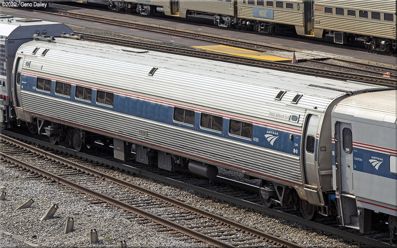 Built as an Amcafe with 51 coach seats on either side of the snack bar in September 1975 and numbered 20007. Built as an Amclub with 18 club seats, snack bar, and 23 coach seats in May 1976 and numbered 20132. Refurbished with 14 four-place booths in September 2003 and renumbered 28361. Trainline-equipped for push-pull operation and converted to a Club-Dinette with 18 club seats and 6 four-place booths in March 2005 and renumbered 48189. Historical information about this car provided by www.amtrakbythenumbers.com. |
